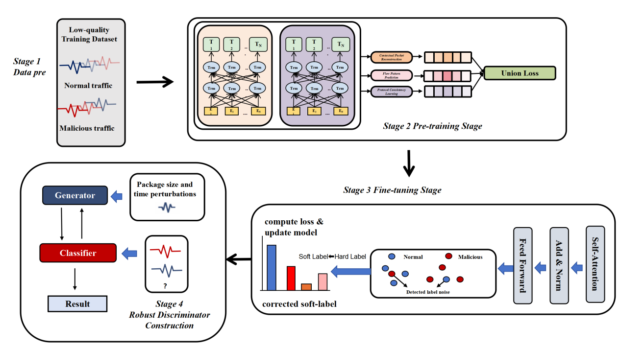 随着网络加密技术的广泛应用,加密流量占比持续增长。加密技术在保护用户隐私的同时,也为恶意流量检测带来了严峻挑战。当前加密流量检测面临以下难题:恶意样本稀缺导致严重的类别不平衡,自动化标注过程引入大量噪声标签,以及攻击者可通过修改流量特征实施对抗性逃逸,从而导致恶意加密流量检测困难。