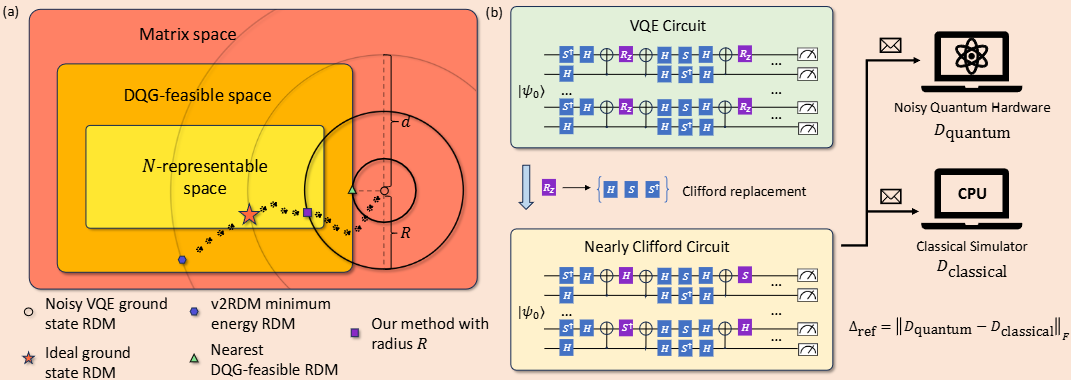 中心高性能计算部参与的研究团队基于经典后处理思路,对量子设备测得的“双电子约化密度矩阵”施加严格的物理约束(即N-可表示性条件),并引入基于范数的距离约束,确保校正后的结果既符合物理规律,又与原始实验数据保持一致性。