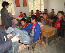 受捐人是河池地区的一所小学。校长收到包裹后,即刻组织了衣物的发放活动。此次发放主要是在学校的班级中进行,由老师将衣物发放给学生,学生再带回家中。老师们根据学生情况、衣物情况进行了分发,同学们秩序井然地领取了捐赠的衣物。