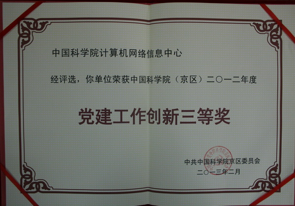 2012年,网络中心在中科院京区党委的指导帮助下,在中心领导、党委、党办、各支部的大力支持配合下,认真完成京区党委、中心党委布置的各项党建工作。在思想建设、班子建设、支部建设等方面夯实基础、助力创新,尤其围绕十八大,开展了一系列颇具特色的党建活动,荣获了中国科学院(京区)二○一二年度“党建工作创新三等奖”荣誉称号。