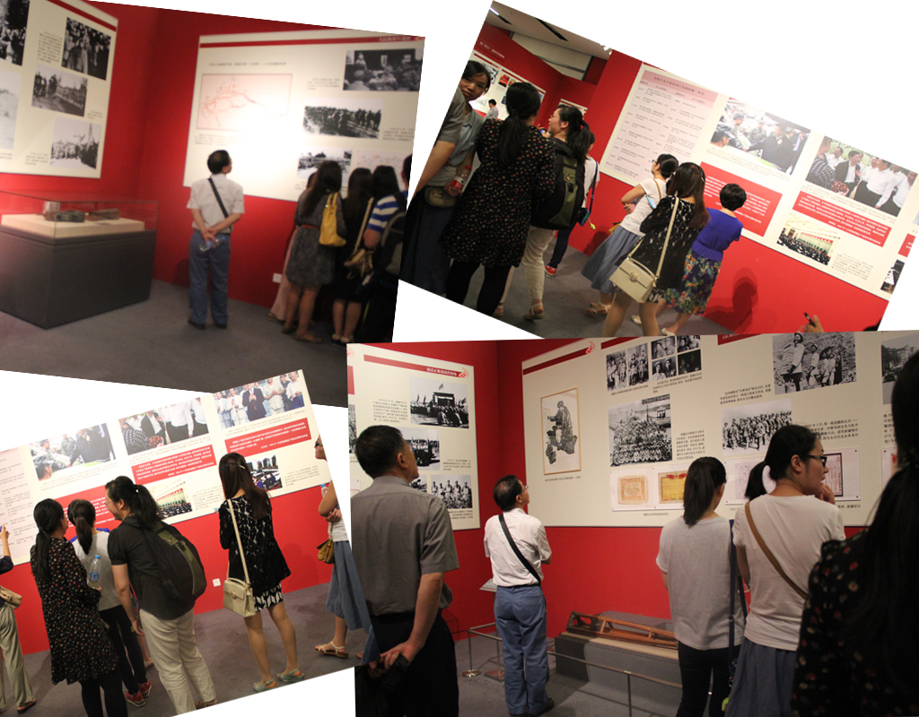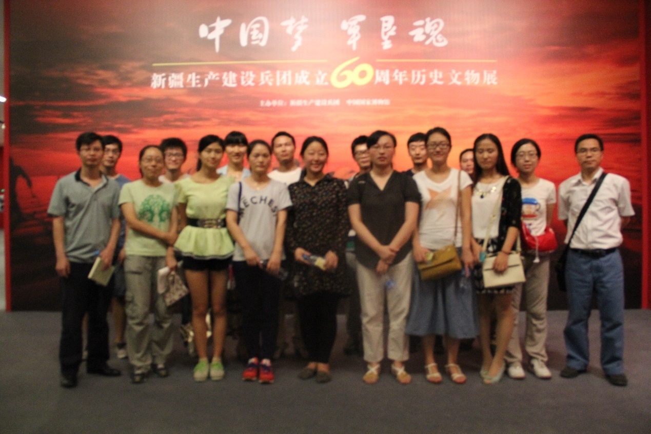 自1954年新疆生产建设兵团成立至今,这支从井冈山、南泥湾走来的英雄部队在天山南北屯垦戍边已走过60年的辉煌历程。带着敬仰进入展厅后,大家开始各自认真参观,本次文物展一共分为五个部分进行展示,分别为:战略决策、长期建疆、团结稳疆、安边固疆、展望未来。每个部分又细分为单元,第一部分战略决策包含新疆和平解放、人民解放军进疆和创建和发展兵团的战略决策两个单元;第二部分长期建疆包含发展现代农业,建立现代工业和建设军垦新城三个单元;第三部分团结稳疆包含维护民族团结、促进兵地融合和坚持劳武结合、维护社会稳定两个单元;第四部分安边固疆包含形成屯垦戍边战略布局和增强备战边防实力两个单元;第五部分展望未来。大家依次参观和学习了这段辉煌历程。