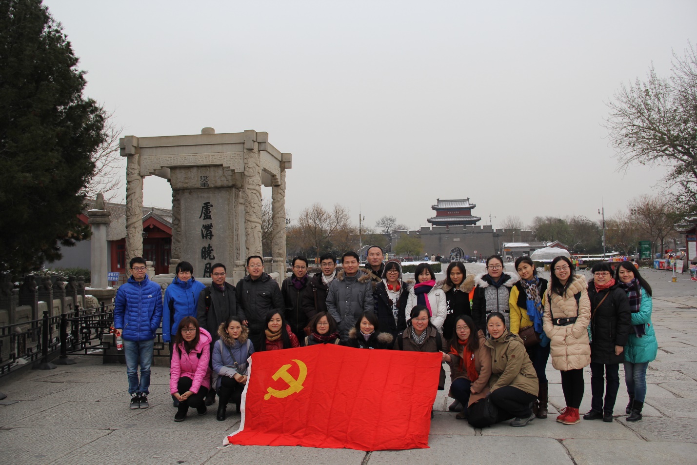 活动当天天气较冷,前几天的雪还没彻底融化,天空中又飘起了雪花,支部活动按照原计划进行。党员们漫步于桥上,惊叹于先人们精巧雕工,匠心独具造就的千姿百态的石狮子;看到有些狮子上留下的子弹痕迹,不禁联想到七十年前的那场战火洗礼中,忠勇无畏的先辈们,用自己的血肉之躯捍卫了中华民族不屈的尊严。在卢沟桥上,同志们聆听了讲解员描述的那段中华民族血泪史——1931年9月18日,制造了“九一八”事变,占领东三省,扶持伪满洲国;继而占我热河,夺我资源,奴我人民;1937年7月7日, 日军借由丢失一名士兵而制造蓄谋已久的“卢沟桥事变”,发动全面侵华战争。八年抗战,日寇屠我同胞三千五百万,无数城市积累了数百年的文化古迹受到了毁灭性的损害。共同回望中华民族受尽屈辱的惨痛历史,激发了同志们的爱国情怀。