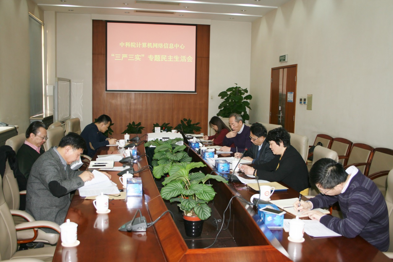 2015年12月31日上午,计算机网络信息中心召开“三严三实”专题民主生活会。中科院副院长谭铁牛、北京分院党组副书记肖建春、干部工作处副处长冯越到会指导。中心领导班子成员参加了会议。会议由党委副书记韩华主持。