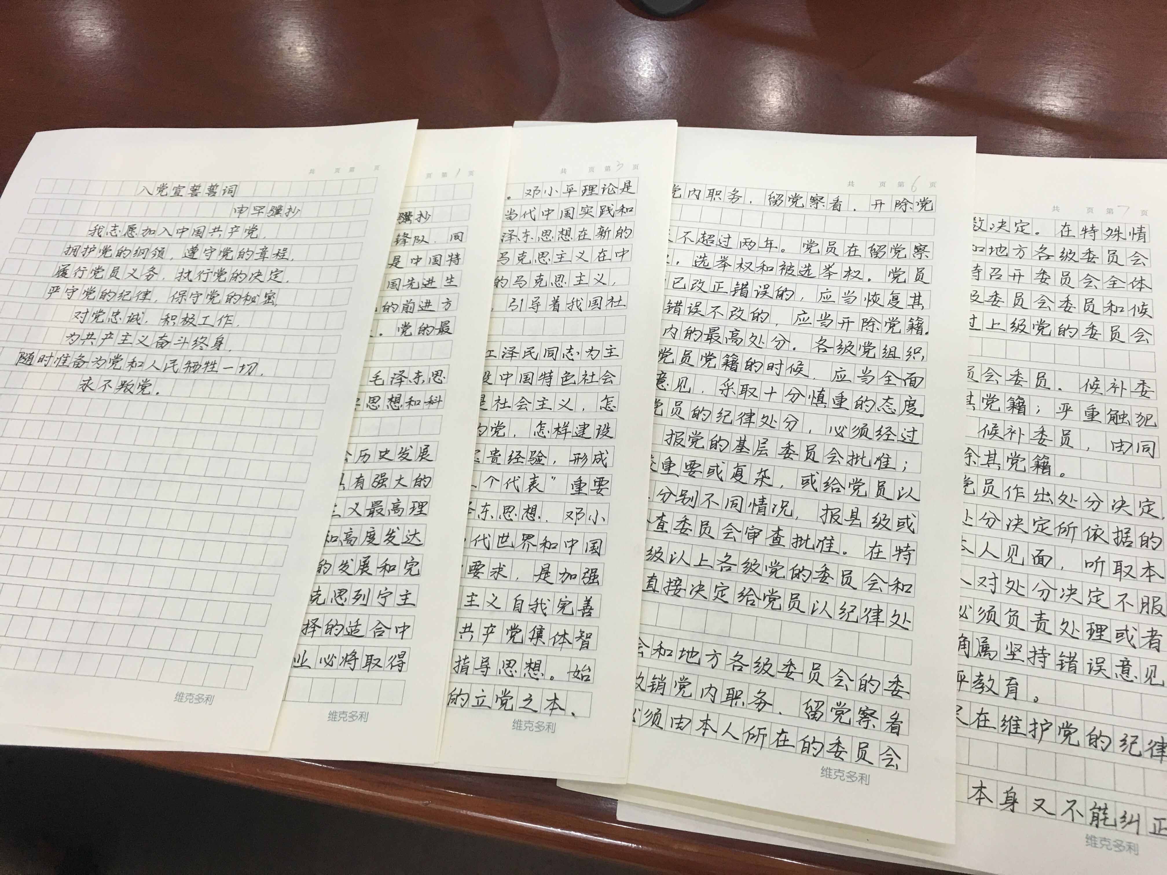 其次,党员们进行“抄党章”手稿的传阅和心得交流。通过交流,大家一致认为“抄党章”是一种学习党章非常有效果的方式,在一笔一划的抄写过程中,党员的自豪感、荣誉感倍增,不少党员表示,抄写党章让大家仿佛回到了当初向党组织递交申请书的时候,回想起当初自己加入共产党的初衷,更加坚定了共产主义信念,明白了作为一名党员应承担的责任和义务。在推选优秀手稿时,田东、申罕骥、朴英超等同志的手稿得到了一致好评,尤其是田东同志,在每次认真抄写完党章都会写上自己的心得,加深了对党章的理解和认识。