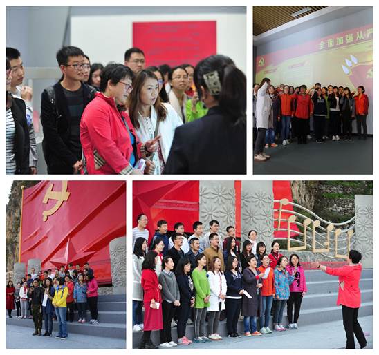 在红歌歌曲联唱环节,由韩华指挥,全体党员在960平方米的党旗下高歌一曲《没有共产党就没有新中国》,嘹亮的歌声响彻山谷。接下来,各支部就精心准备的十余首红色歌曲,展开接力联唱。大家唱出理想,唱出热情,唱出对实现伟大中国梦的决心,将主题活动推向高潮。