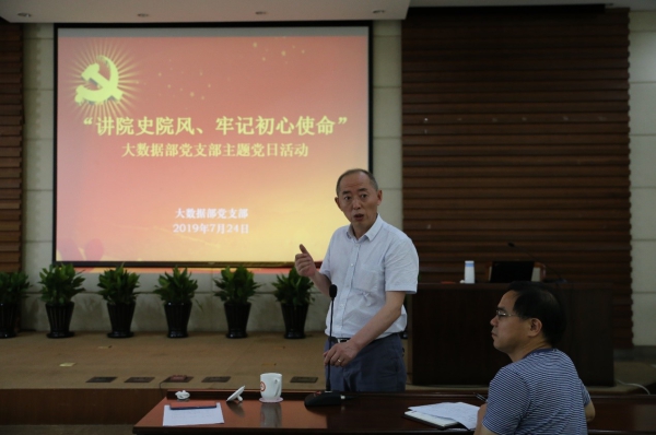 7月24日,大数据党支部开展“讲院史院风、牢记初心使命”主题教育专题党课学习。会议由大数据部党支部书记周园春主持,中心党委支部联系人、中心副主任迟学斌出席会议,大数据部全体员工共70余人参加专题学习和交流讨论。