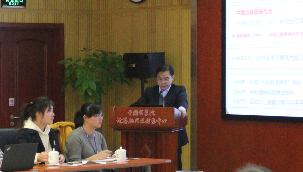 计算机网络信息中心党委委员、大数据与可视化党支部书记周园春为全体党员做了“打造学习型组织、提高科技软实力”主题党日的学习汇报。周园春首先强调了学习的重要性,指出人类历史和中国共产党党史告诉我们,要注重学习,在学习中不断成长,并且重点介绍了习近平总书记关于学习的重要论述,习近平总书记强调“中国共产党人依靠学习走到今天,也必然要依靠学习走向未来”、“梦想从学习开始,事业从实践起步”、“中国要永远做一个学习大国”。随后周园春在学习报告总强调了在当前国际局势下,科技软实力的重要性,而由数据、计算和网络融合成的新一代信息化基础设施对促进科技创新,提升科技软实力具有重要支撑。接着,周园春从计算机网络信息中心的发展历程、科学数据积累与沉淀、烟草科研大数据专项的进展情况做了详细的介绍。最后,号召全体党员打造学习型组织,提高科技软实力,用行动助力“中国梦”的实现。