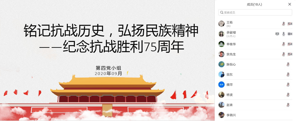 9月25日,为纪念中国人民抗日战争胜利暨世界反法西斯战争胜利75周年,学习习近平在中共中央国务院中央军委举行的“纪念中国人民抗日战争暨世界反法西斯战争胜利75周年”座谈会上的重要讲话精神。大数据与可视化党支部第四党小组在组长余敏槠的主持下开展“铭记抗战历史,弘扬民族精神”的主题学习会。第四党小组全体党员、积极分子、学生党小组部分党员参加了学习。