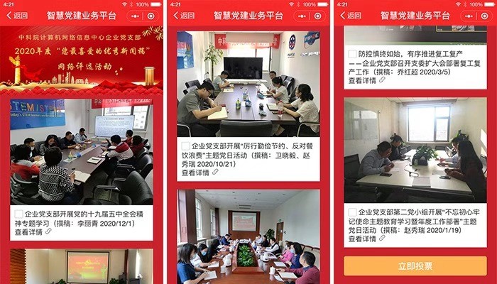 企业党支部作为计算机网络信息中心最年轻的支部组织,在成立后受到了中心党委各级领导的亲切关怀和大力支持,企业党支部始终以“不待扬鞭自奋蹄”的精神高标准严要求落实中心党委各项任务,主动创新组织工作方式方法,在支部活动宣传方面,建立了全员“通讯员”党务宣传创作激励机制,截至12月1日,年度累计在中心官网党群园地栏目发布新闻稿15篇。 为推动创新型支部建设和党员党性素养的提升,鼓励全体党员积极参与党委和支部工作的科学传播和稿件创作,2020年12月8日,在中心党委的大力支持下,企业党支部成功举办了“2020年度您最喜爱的优秀党建新闻稿”网络评选活动,营造了良好的党建文化氛围。