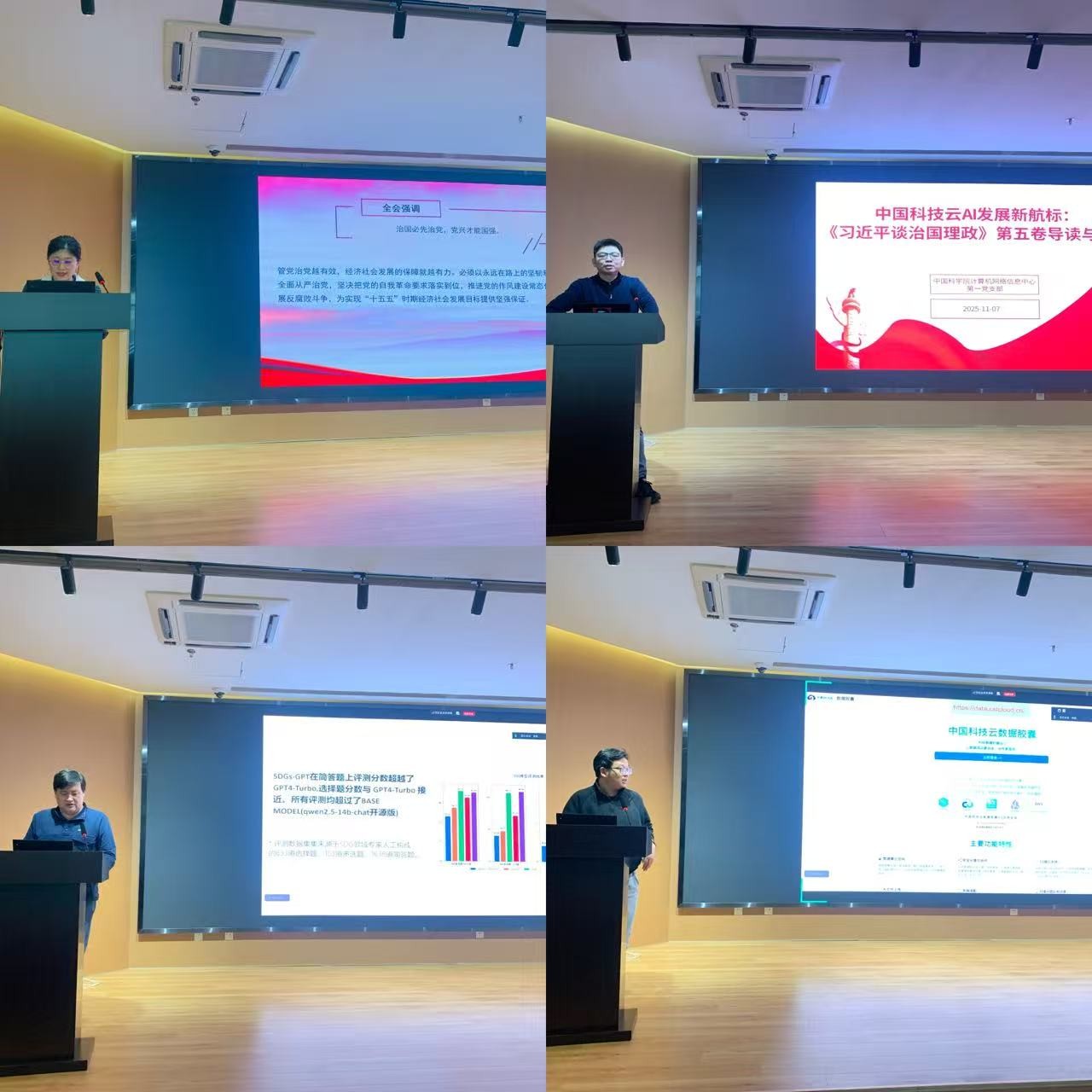 业务交流环节,中心第一党支部李菁菁同志做“AI时代下的科研信息化技术演进及实践”专题报告,探讨中心以及第一党支部AI for Science驱动下的科研规划实施。第一党支部陈灿、郑依华等同志详细介绍了中国科技云在垂域大模型训练、AI应用服务方面的最新工作。