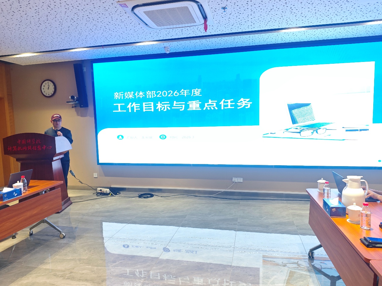 党支部书记王闰强首先系统介绍了新媒体部2026年度重点工作部署。他围绕“3+5”战略目标,结合年度目标与量化指标体系,从重塑中国科学院科学传播体系、提升中国科学院科普品牌影响力、引领国家科技文化传播与科学教育发展、强化人工智能技术研究与应用、加强党建工作五个方面,对全年重点任务进行了全面部署。
