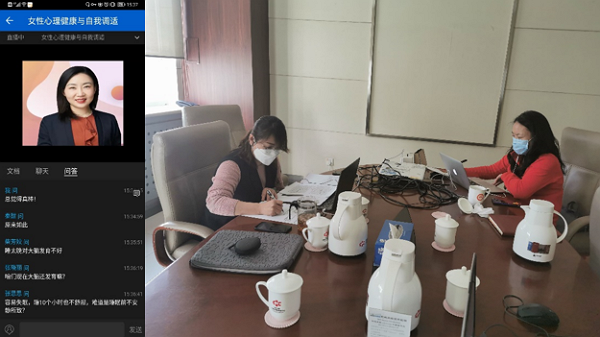 在这个特殊时期,春天还是如约而至。3月10日下午,在计算机网络信息中心党委的大力支持与关爱下,中心妇委会在第110个“三八”国际劳动妇女节到来之际,邀请中科院心理所黄峥教授,为大家带来一堂《女性心理健康与自我调适》直播课程,全程通过CASMOOC平台进行直播,以这种特殊的方式庆祝别样的妇女节。本次课程吸引了130余位女科技工作者在线学习,中心党委书记韩华参加学习活动。活动由中心妇委会主任邓嵩主持,新媒体部在线教育技术实验室技术支持。