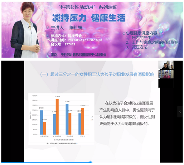 3月19日下午,中心妇委会联合工会邀请中科院心理所陈祉妍老师以空中课堂方式为女职工开展了《减持压力,健康生活》心理健康专题讲座。陈祉妍老师从“何为压力”讲起,详细分析了压力产生的各种情况,从不同维度讲述了工作与家庭出现冲突的情况,同时用“有用吗”、“真的吗”、“又怎样”的方法去加强自我调节,让广大女职工学会如何在工作和家庭中寻找属于自己的平衡点,让工作更加出色,让生活更加有激情。