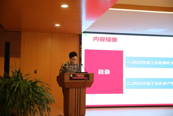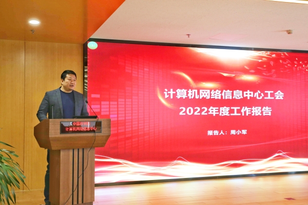 会上,工会副主席周小军以《守正创新和谐发展 凝心聚力科技创新》为题作计算机网络信息中心工会2022年工作报告。报告从实施同心向党行动,把思想政治引领贯穿工会工作始终;实施岗位建功行动,围绕科技创新中心工作,引导广大职工展现新作为;实施温暖关爱行动,竭诚服务职工群众,提升职工幸福感获得感;实施民主管理促进行动,切实维护职工合法权益;实施组织建设提升行动,夯实工会组织,提升战斗力等五个方面全面总结了中心工会一年来的主要工作及成效,并对2023年工作进行了展望。