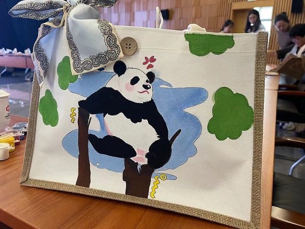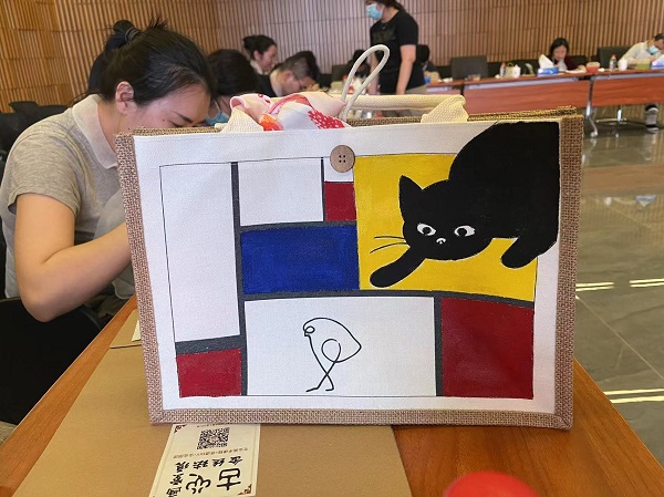 第二分工会组织分工会成员学习在帆布包上绘制图案。