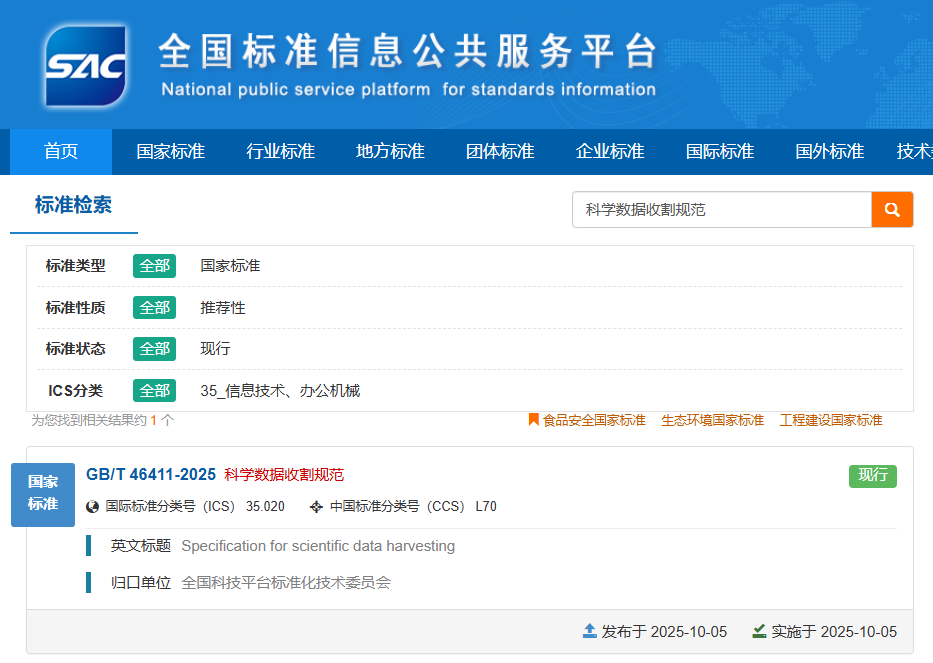 近日,国家标准化管理委员会通过官网发布《中华人民共和国国家标准公告(2025年第24号)》,中国科学院计算机网络信息中心牵头研制的GB/T 46411-2025《科学数据收割规范》正式发布并同时实施。该标准由全国科技平台标准化技术委员会(TC486)归口,主管单位为科学技术部。标准的详细信息可查阅全国标准信息公共服务平台(https://std.samr.gov.cn/noc/nocGB)。