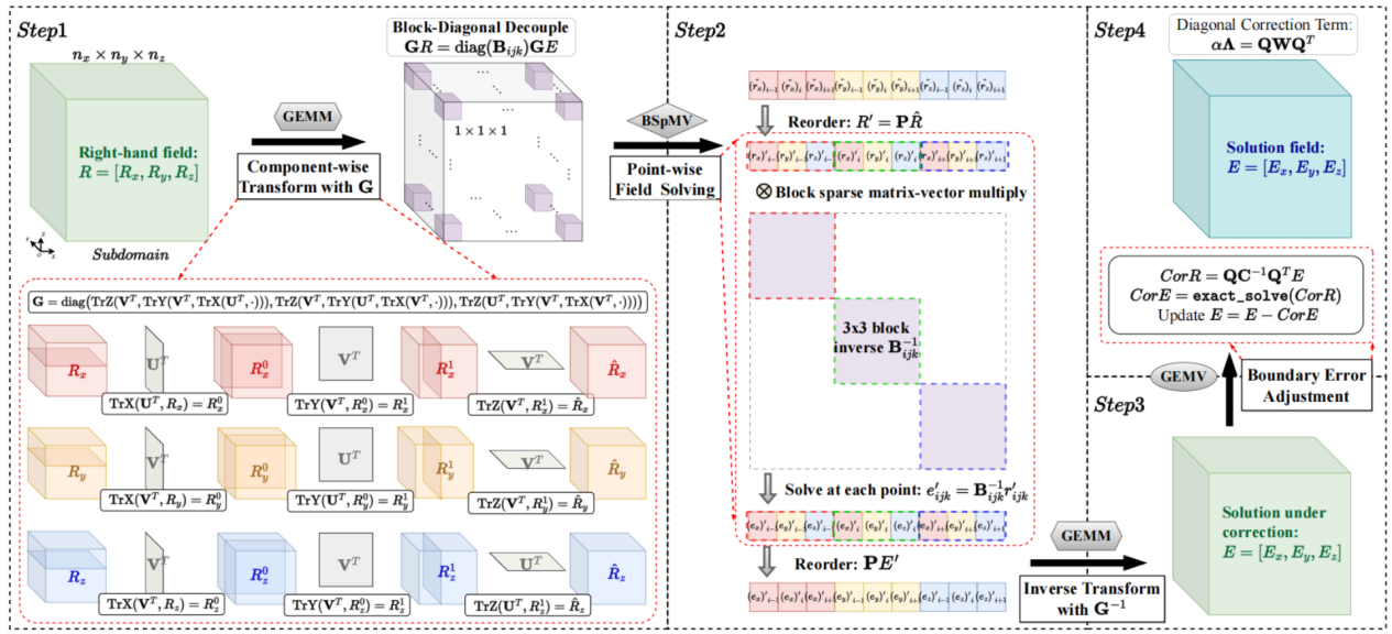 近日,我中心高性能计算部科研团队提出了一种基于离散变换的子域精确预处理系统——FlashMP,用于高效求解CN-FDTD方法中的线性系统。该方法首次在GPU集群上实现了对电磁方程预处理求解的实用加速,显著提升了大规模电磁模拟的计算效率。