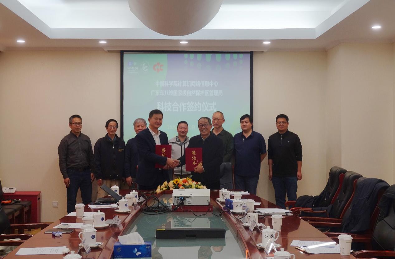 11月20日,计算机网络信息中心与广东车八岭国家级自然保护区管理局在北京中国科学院部签署科研合作协议。中国人与生物圈国家委员会秘书处副主任先义杰、副主任郭晓涛、中国科学院计算机网络信息中心党委书记孙德刚、广东车八岭国家级自然保护区管理局局长束祖飞,以及来自中国人与生物圈国家委员会专家咨询委员会、北京大学、清华大学、“一带一路”国际科学组织联盟(ANSO)秘书处、中国科学院地理科学与资源研究所等单位的相关专家出席了签约仪式。
