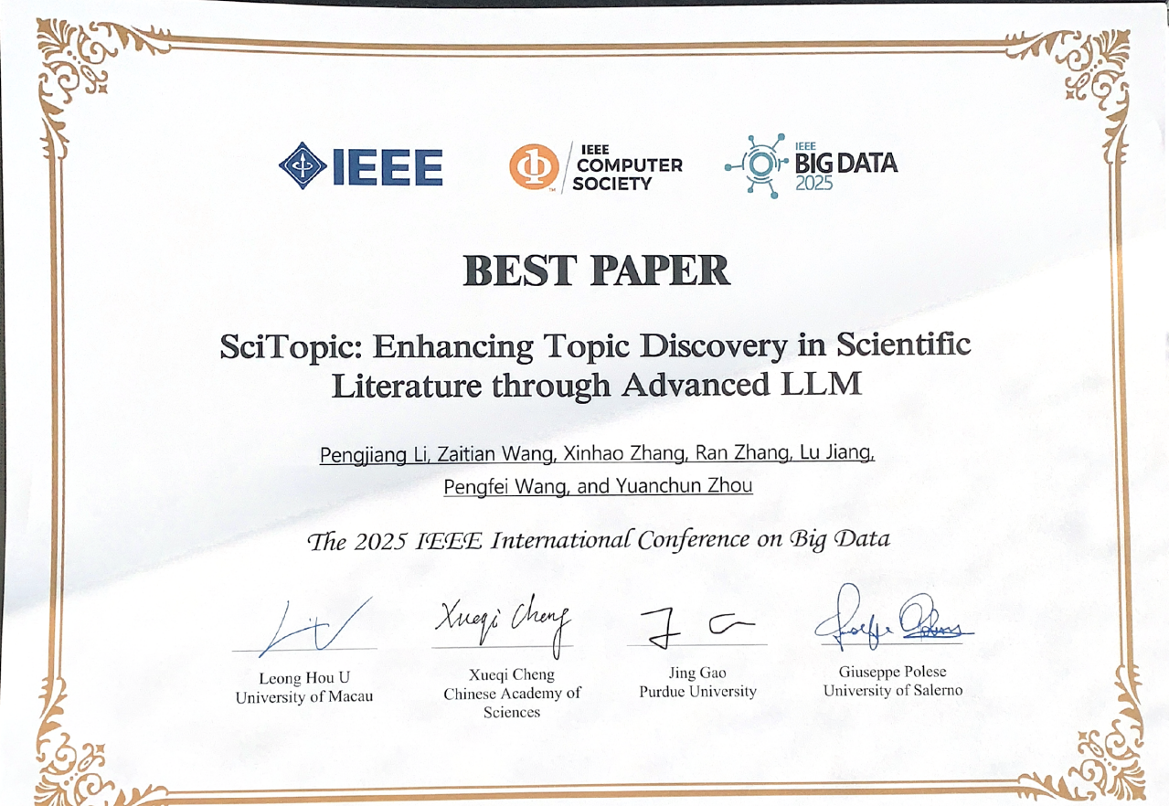 Pengjiang Li,Zaitian Wang,Xinhao Zhang,Ran Zhang,Lu Jiang,Pengfei Wang,Yuanchun Zhou. SciTopic: Enhancing Topic Discovery in Scientific Literature Through Advanced LLM. IEEE BigData 2025.