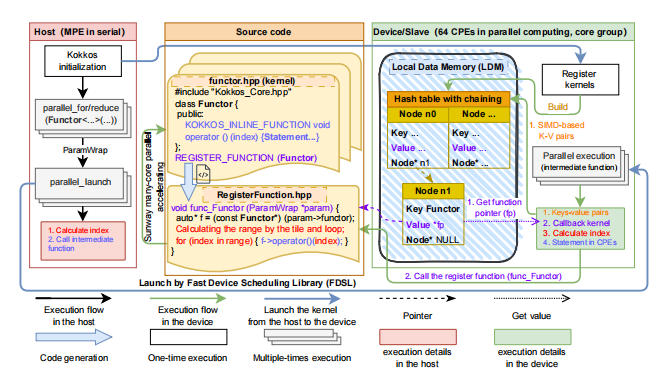 研究团队针对神威处理器独特的硬件约束,通过引入并行执行抽象,实现了源代码到二进制级别的性能可移植,有效打破了C++模板密集型库难以在神威从核执行的障碍,极大降低了超算应用的开发与迁移成本。swKokkos引入了向量化哈希索引与FDSL快速调度库以降低内核启动开销,并提出分块并行映射算法来提升负载均衡与缓存利用率。在AXPY、数值求解器等任务中,swKokkos性能达到原生 Athread的 99%以上,并在海洋模型LICOM中成功支撑超10万核规模的稳定模拟获得显著加速。