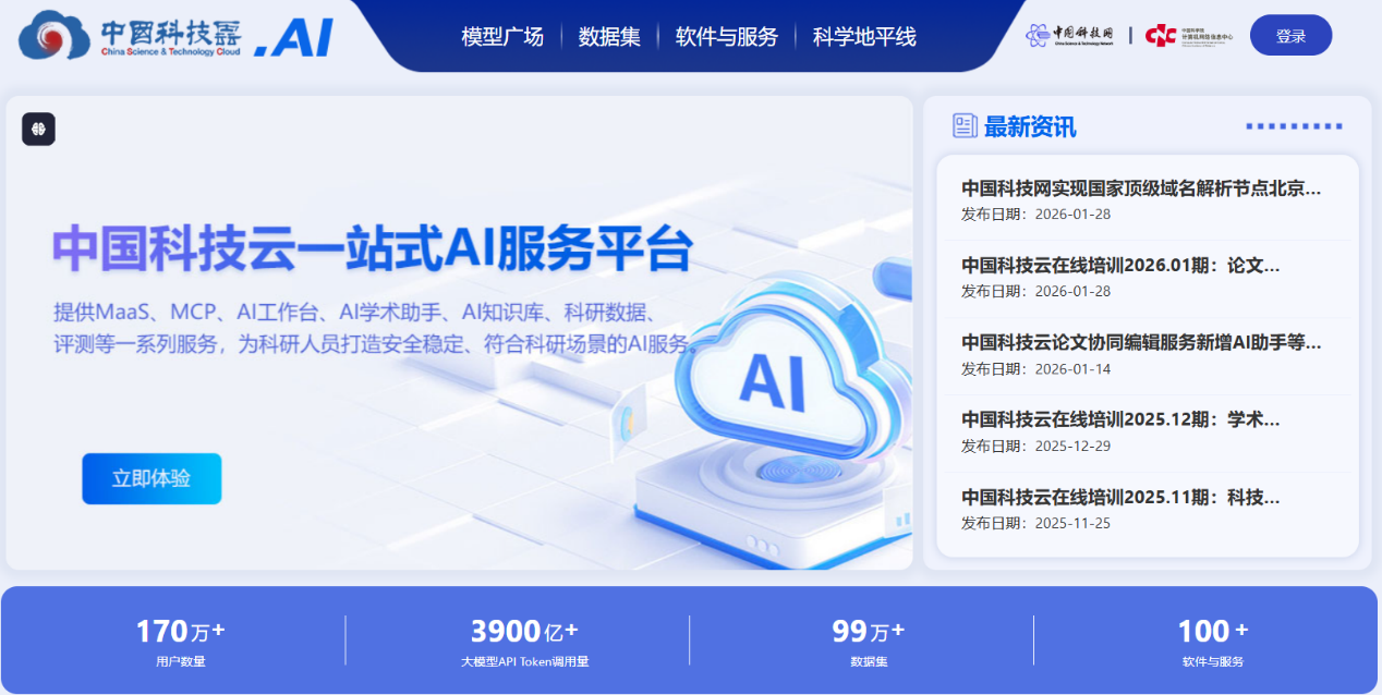 近日,中国科技云(CSTCloud)一站式AI服务平台正式完成重磅升级并上线运行。平台旨在响应“AI for Science”科研新范式需求,通过整合大模型、高质量数据集及科研软件资源,为广大科研人员提供安全、稳定、符合科研逻辑的AI全流程支撑。升级后,平台聚合了模型广场、科学地平线、数据集以及AI软件与服务四大核心模块,动态发布AI4Science前沿趋势、中心最新研报及用户培训通知。